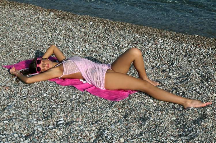 Пляж с красивой девушкой без трусиков у воды