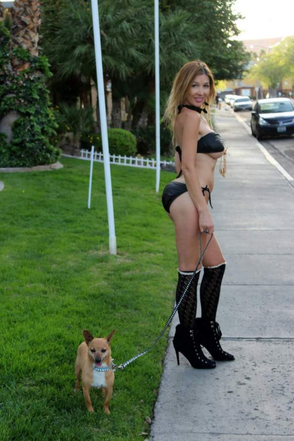 30-летняя американская певица русско-французского происхождения, которую еще называют «Русской Леди Гагой», Нади Волянова (Nadeea Volianova) выгуливает собачку в белье в Беверли-Хиллз.
