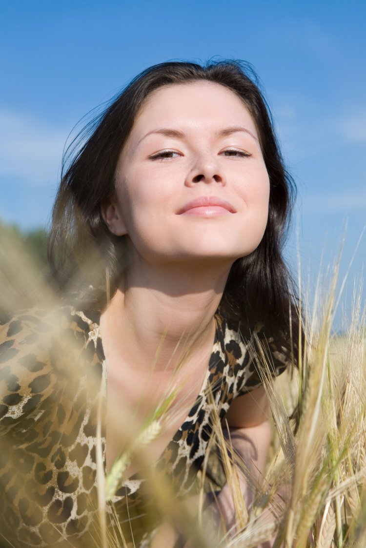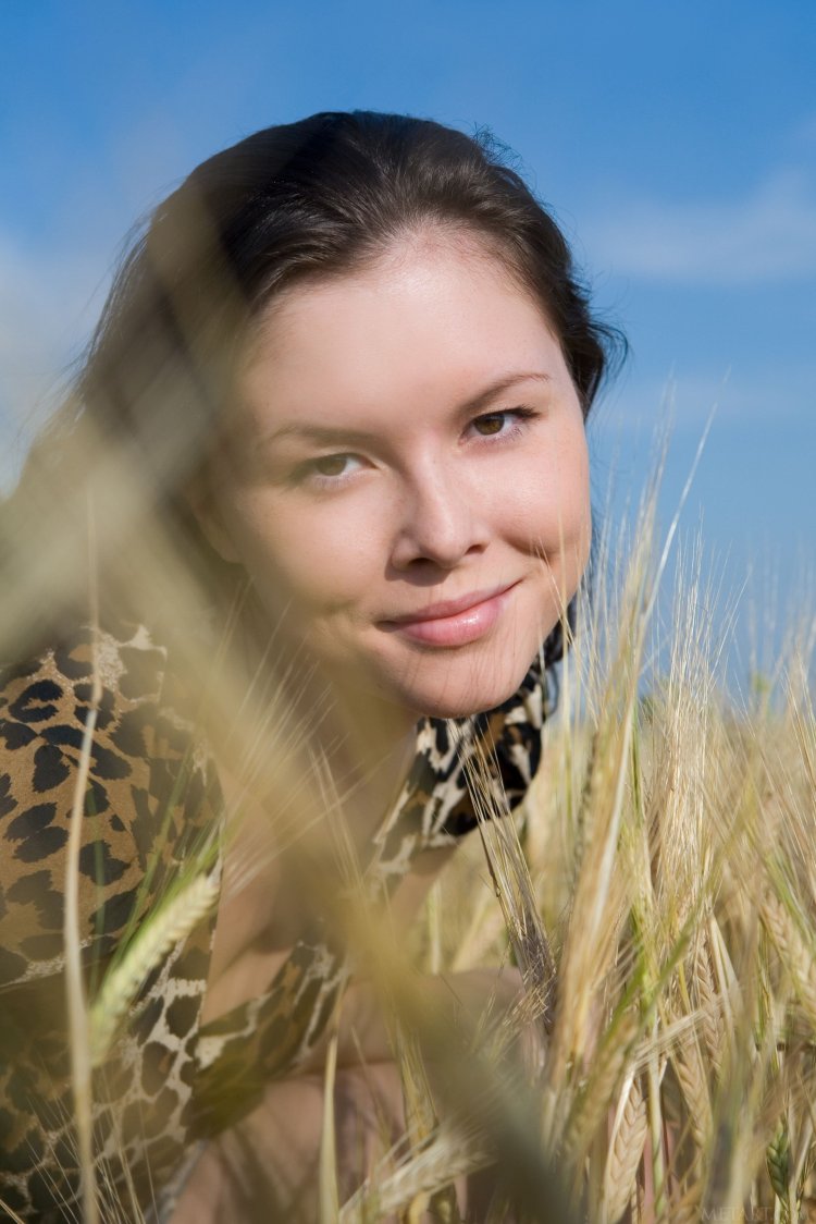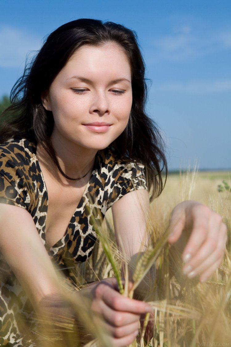 Загадочная красотка позирует посреди поля. Она не спеша сняла сексуальное платье и показала свое достояние. Женщина берет в руки колосок пшеницы и эротично проводит ним по возбужденным соскам. После чего дешевка ложится на покрывало и показывает крупным планом незначительно лохматую щель и крутой задок.