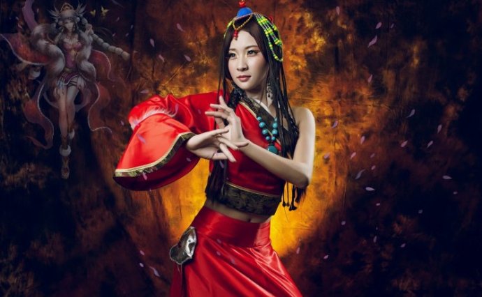 Азиатка в Красноватом прекрасное платье.