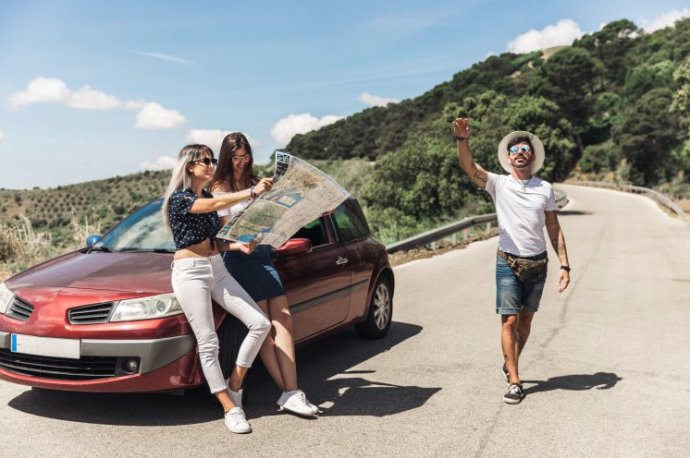 Дороге 2 очаровательные женщины и мужчина.