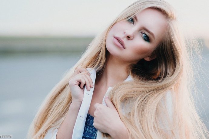 Блондиночка с развевающимися волосами.