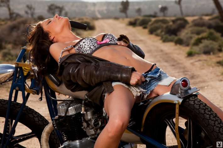 Молодая и стройная шатенка Beth Williams фотографируется в кожаной косухе на классном байке и показывает нам свои сексуальные ножки. После этого модель начинает постепенно снимать с себя одежду и показывает свои сиськи с упругими, возбужденными сосками. После этого девушка становится раком и медленно стягивает трусики, что бы показать свои прелести!